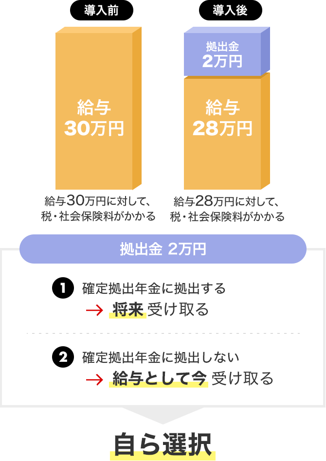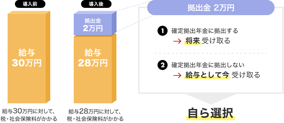 「選択制 401k」を導入すると、給与の中に新たに拠出限度額範囲内で社員自らが拠出する金額を選択、決定することが可能であり、仮に拠出することを決定した場合は、拠出金額を差し引いた額に対し、税金や社会保険料がかかる仕組みになっています。